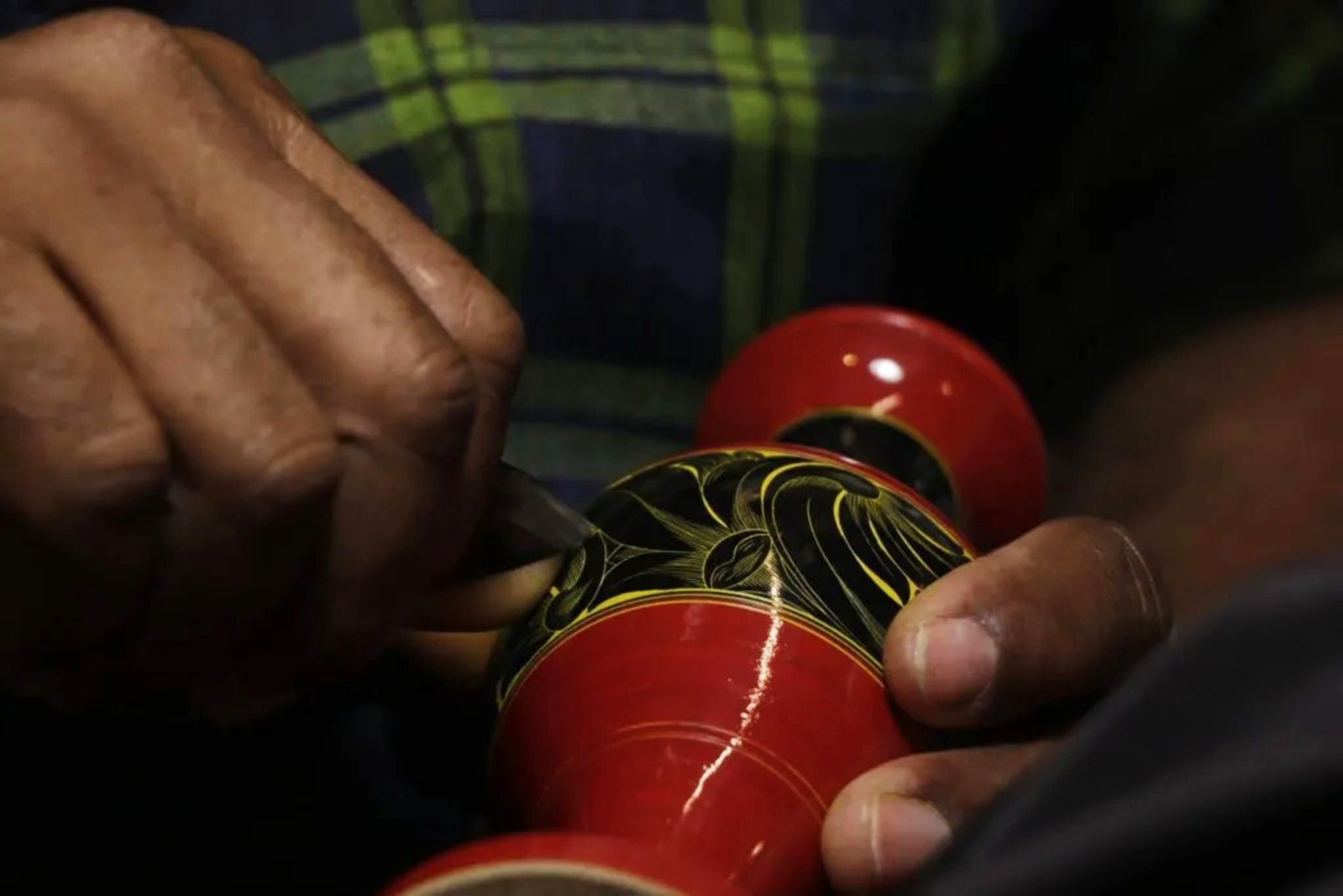 The craftsperson applies the lacquer in layers over the spinning wooden base with a tool called Ihaa Gondi. The layers are applied in line with their vision for the design, with yellow being the first. As the layers go on, they’re polished with dried banana or coconut palm leaves.