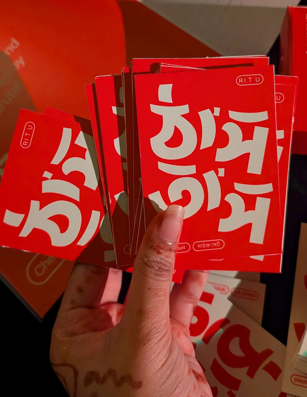 The story behind this is a bit funny. When I was in the 8th grade, I used to religiously watch an anime called Chihayafuru, which is about Japanese Karuta. Years later when I had to come up with ideas for my thesis, I wanted to do something with Bangla poetry, and it all sort of suddenly connected - making a Bangladeshi game inspired by Karuta because Bangla has so much poetic media. However I really wanted to have our own twists to it, tying it with the six seasons and all, developing our own points system. That's also kind of why it's not fully out to the public yet because I want to refine the mechanics of the game more.