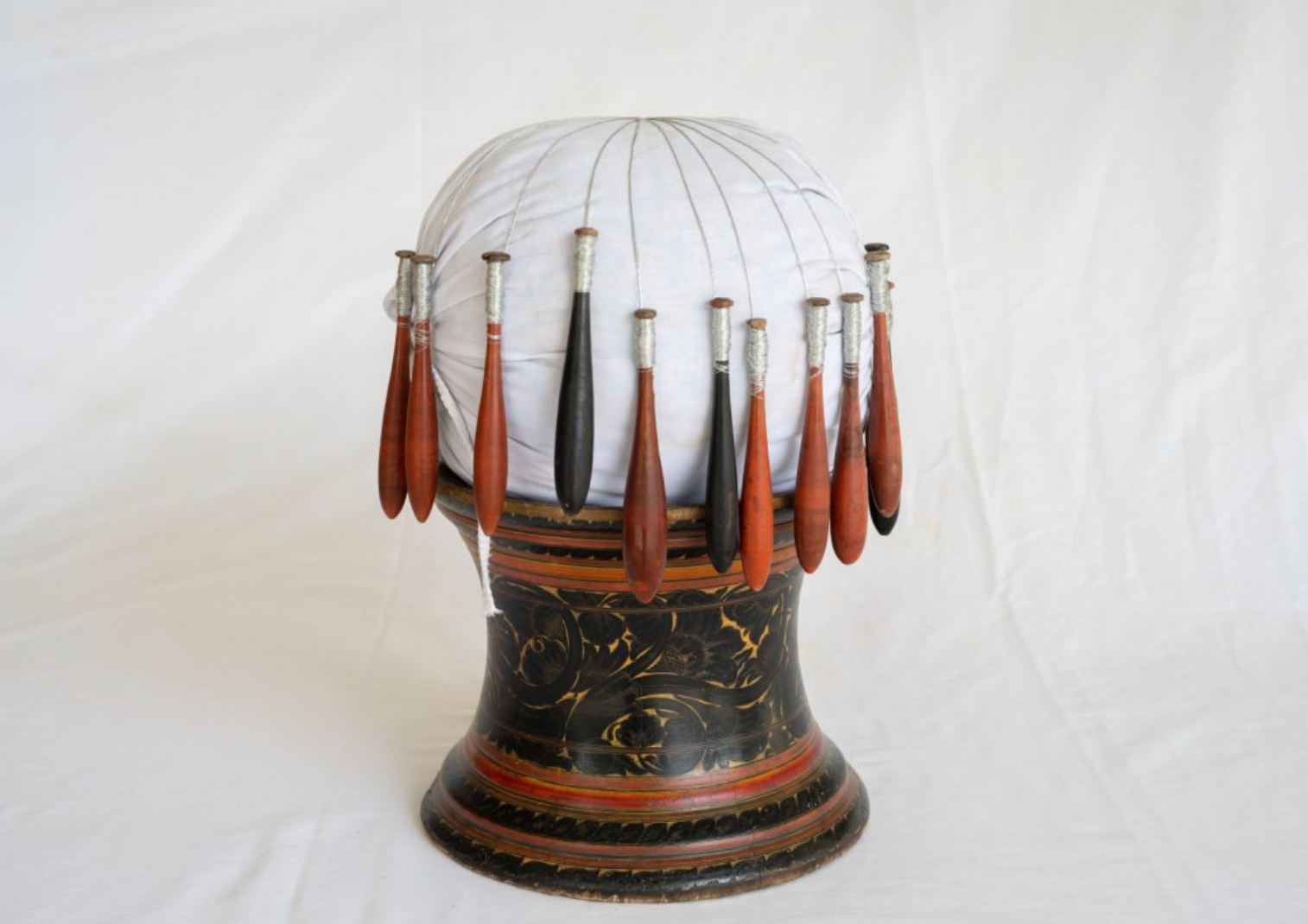 Kasabu Gethun uses wooden bobbins made of Iron Wood or Lime Berry Timber, with yarn wound around them (foali) (img. 10). The specific wood does not splinter, and is appropriately weighted for the purpose of making the lace. These are pinned and suspended from a round cushion called Gaatha boa, which rests on a vase-like wooden stool called Gaatha fai (img 13). The term is also used to refer to the whole setup. The gaatha fai is often made using the traditional lacquer work craft called Liyelaa Jehun (img. 14). Typically, the boavalhu comprises seventeen rows of lace arranged in a specific order, made with coloured yarn, and gold and silver kasabu (img. 15). Each row is braided with a different number of bobbins, to a different degree of complexity, and has a different name. The most intricate central band, called Rothigandhu (img. 16), is made with coloured yarn and badla. The topmost braid is called Mathee Hiru, which is followed by rows of Hima Hiru (Gold) alternating with Badla Hiru ơr Bagiya (Coloured Braid). Hudhu Hiru (Silver) flanks the Rothigandhu on either side, after which the same pattern as above is mirrored. The outermost rows are called Thiree Hiru,